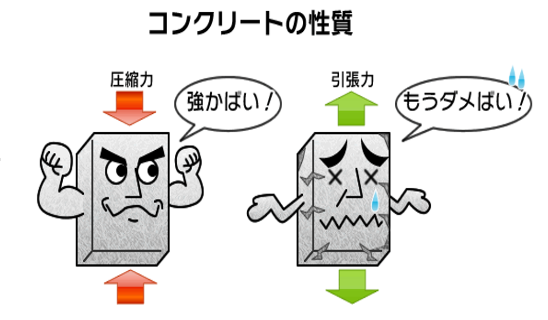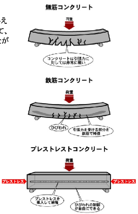 プレストレストコンクリートの略称で、直訳すれば 「あらかじめ応力を与えられたコンクリート」といったところでしょうか。PCの技術を用いることによって、コンクリートの最大の弱点(圧縮には強いが引張には弱い)を克服することができます。