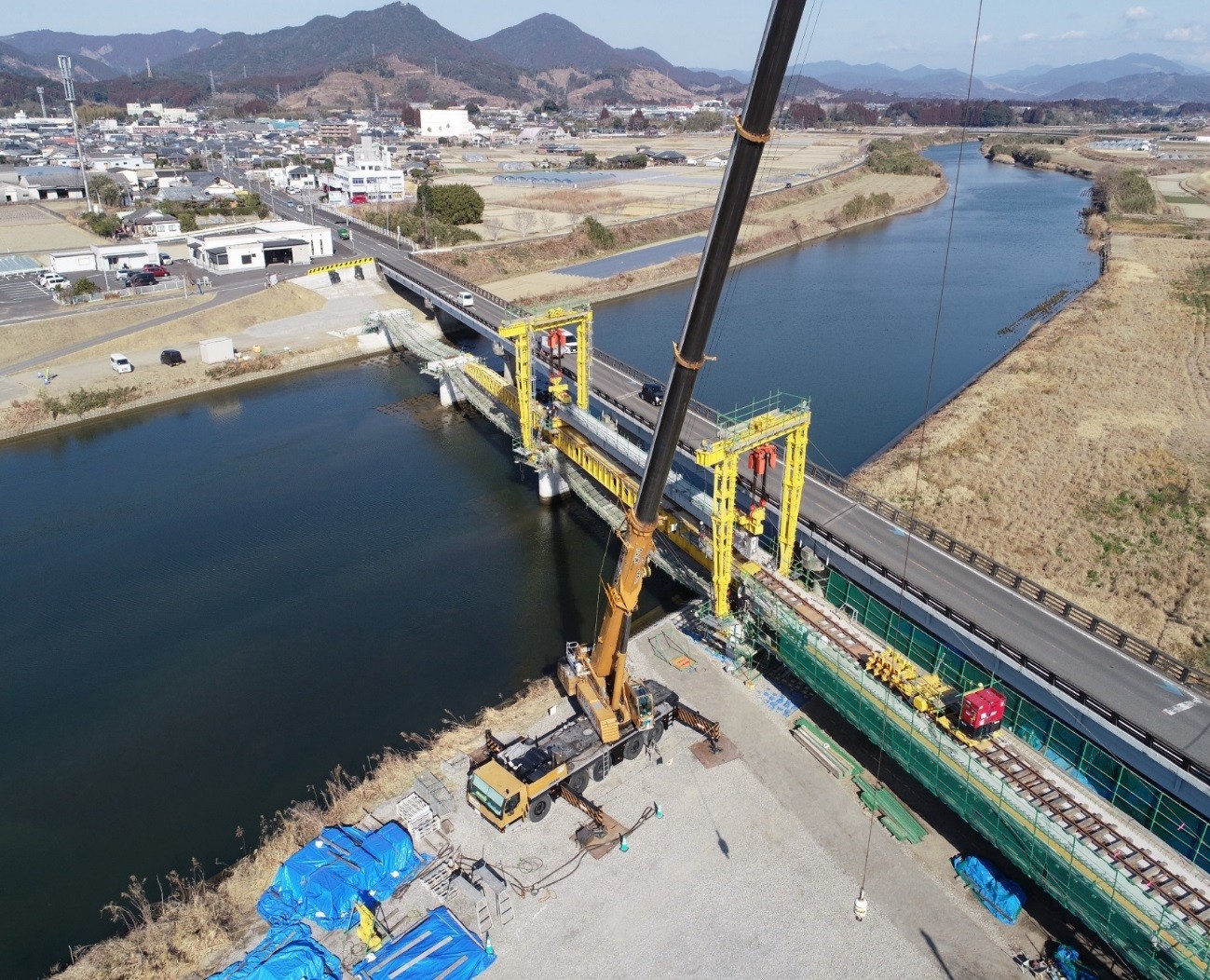 架設工法としては架設桁(エレクションガーダー)による架設とクレーンによる架設が主流となっています。(施工条件によっては架設機械の組み合わせによる架設も用いられます)