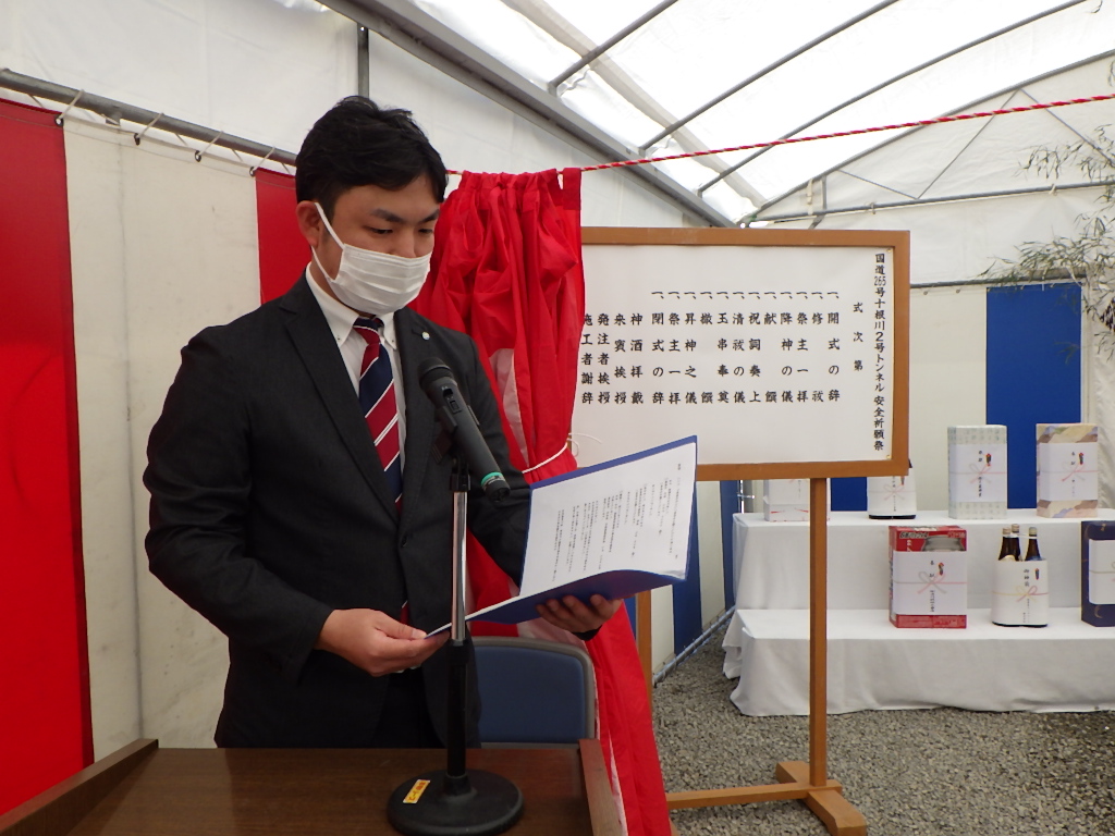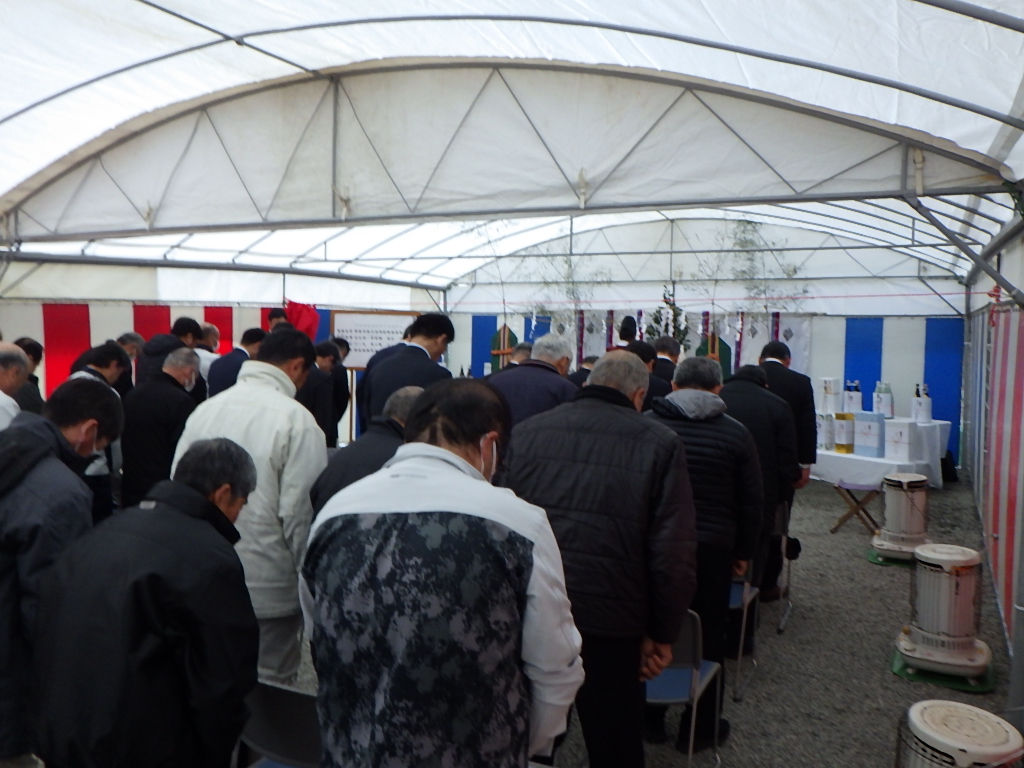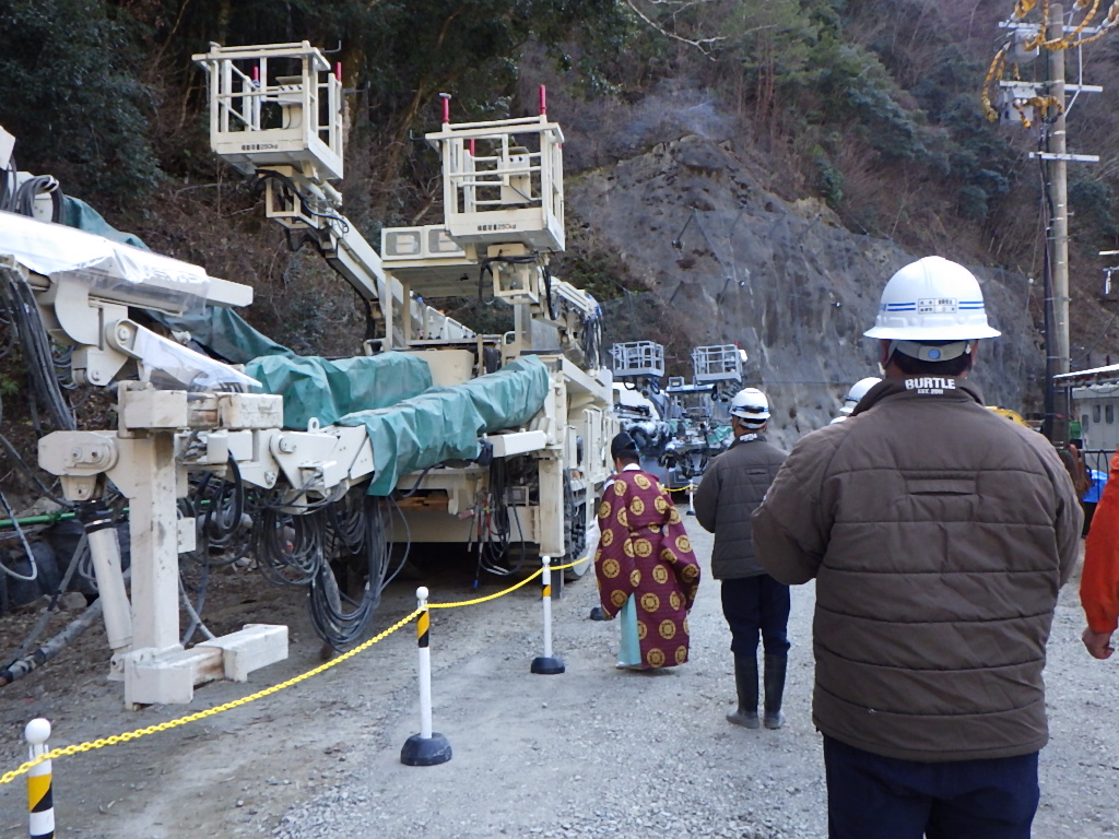 先日、宮崎県・日向土木事務所発注の椎葉村国道265号十根川2号トンネルの安全祈願祭を執り行いました。数日前までの椎葉は、雪も散るほどの厳しい寒さでしたが、当日は降雪はないものの冷え込む中、発注者期間・工事関係者・地元役員の方々にもご参加いただき、総勢65名でトンネルが無事故無災害で完成しますようにと一同で祈願いたしました。