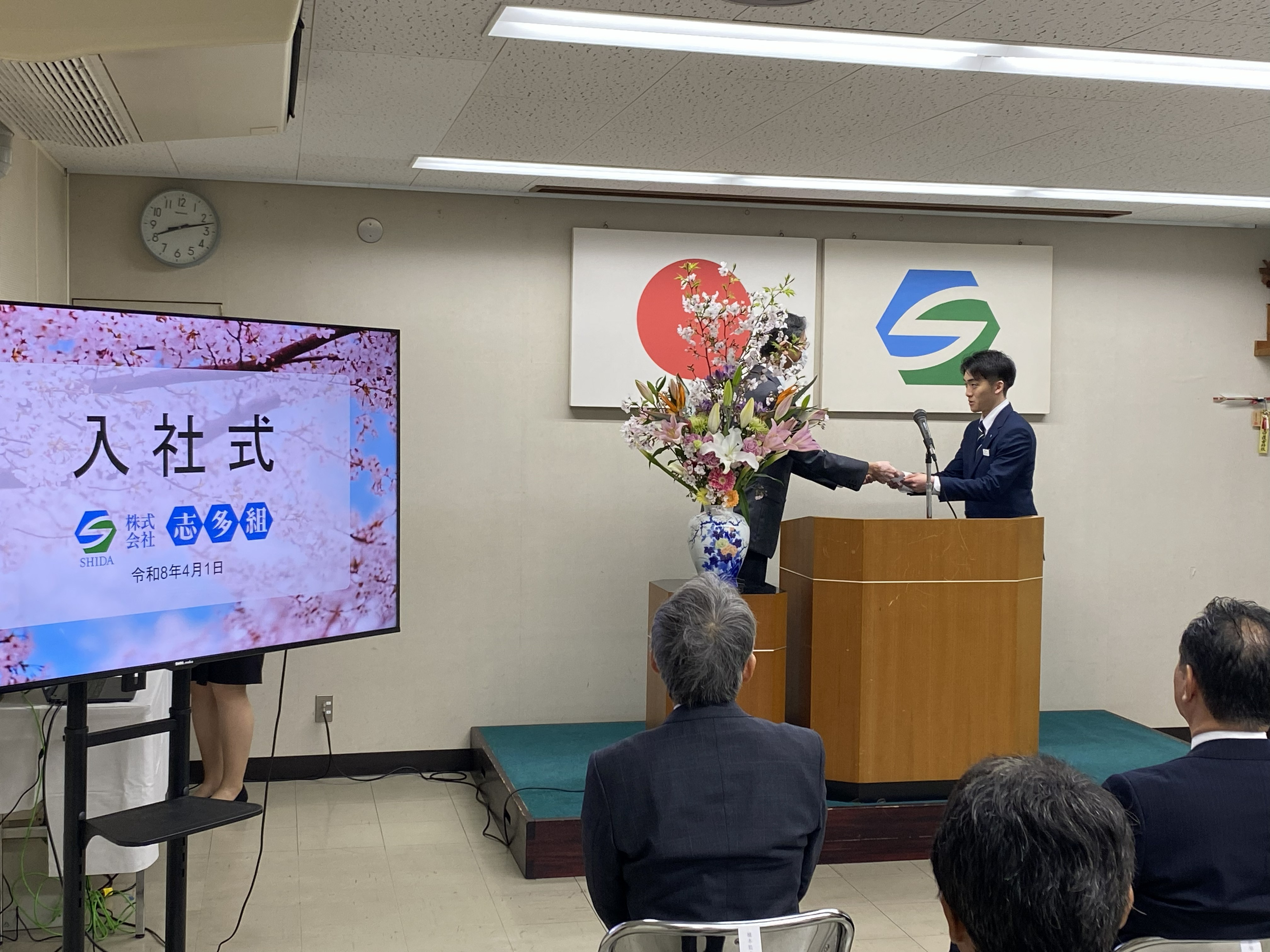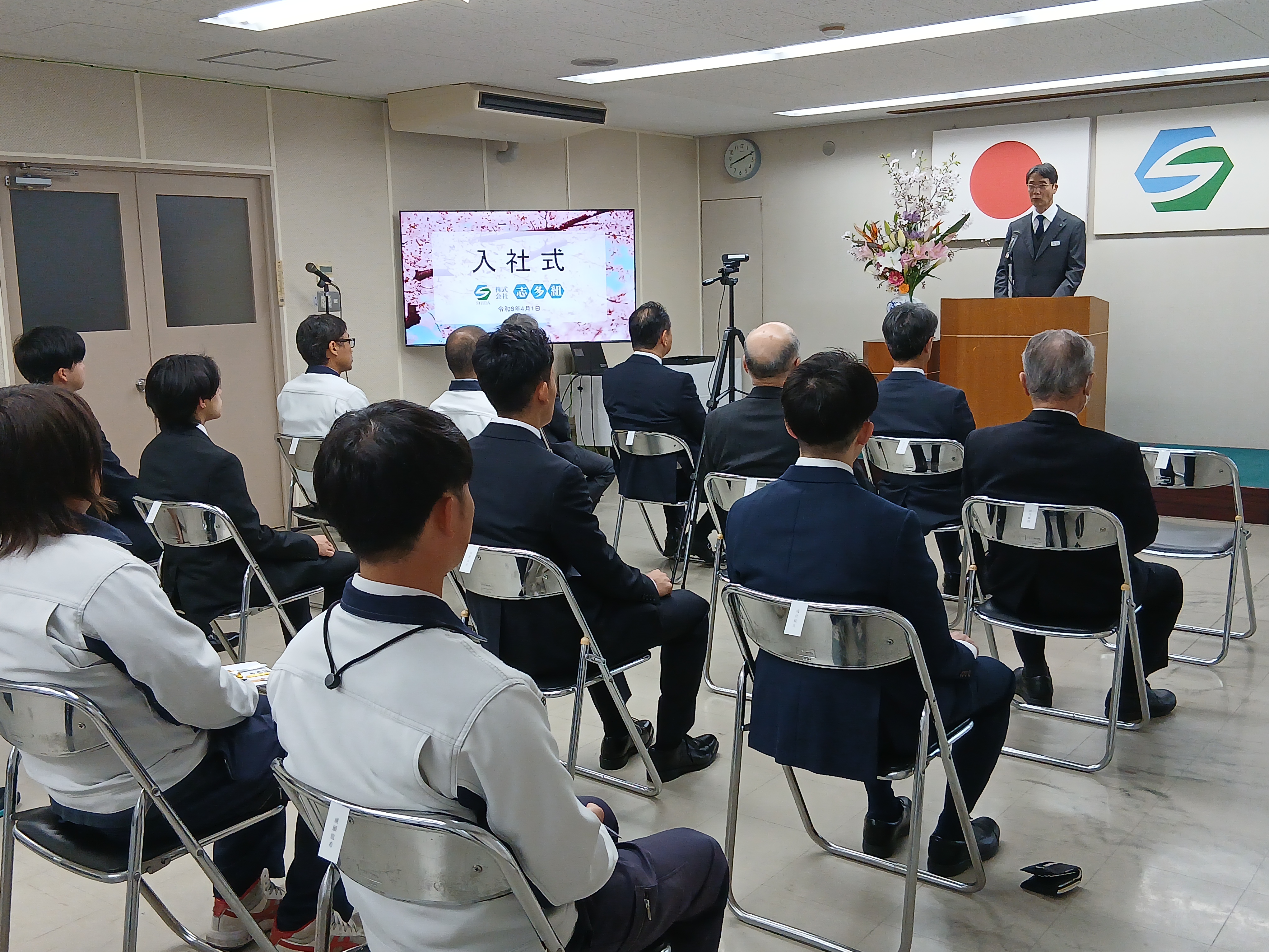 続いて社長からの式辞では、これから、社会人・志多組の一員として新たなスタートにあたり、期待や希望、不安などさまざまな思いを胸に、真剣な表情で耳を傾けていました。