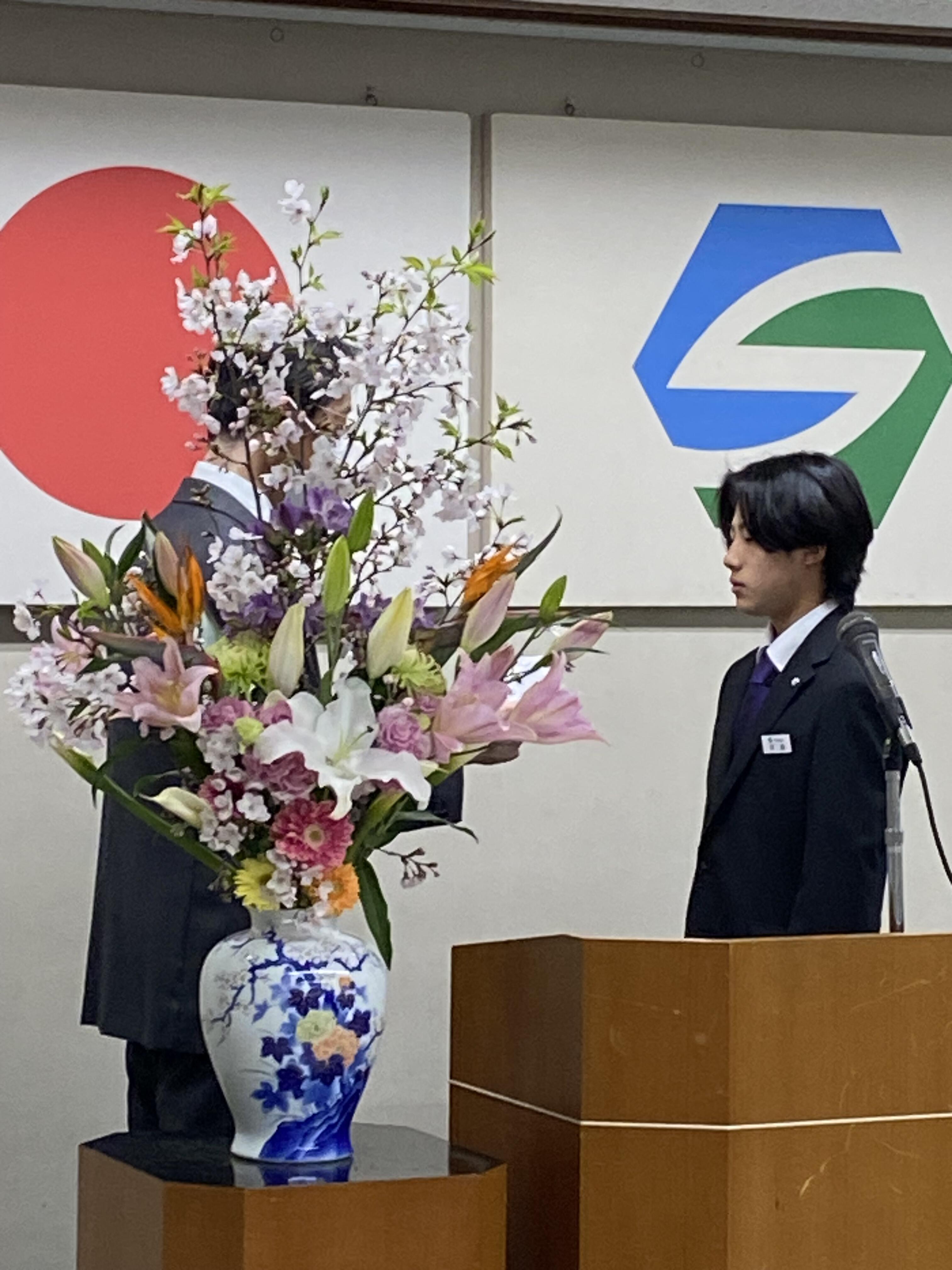 続いて社長からの式辞では、これから、社会人・志多組の一員として新たなスタートにあたり、期待や希望、不安などさまざまな思いを胸に、真剣な表情で耳を傾けていました。